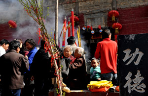 于是,秦始皇就拜老太太为干娘,住了一晚。第二天,秦始皇一行人一早上路,走过一道山坡,又回头看借宿的茅舍,哪里还有踪影?只见绿树掩映中,露出一座玲珑的庙宇。秦始皇不由大吃一惊,心想:我原以为天下的庙宇都已拆完,谁知这座庙宇还完整无缺,想昨晚投宿遇见的老太太,定是神仙所化,但不知是哪家神仙?于是又回头来到庙前,但见庙得石柱上镌刻着一幅对联: